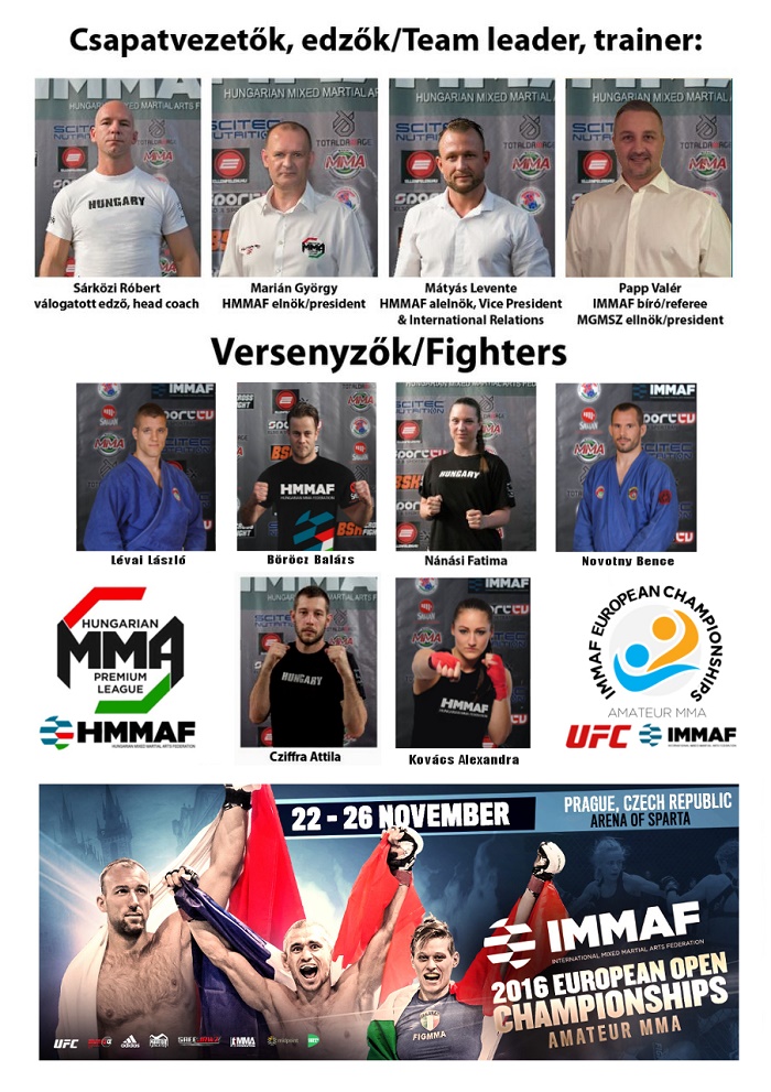 November 21-én, hétfőn regisztrál be a magyar válogatott az idei IMMAF amatőr MMA nyílt Európa-bajnokságra. A Prágában megrendezendő tornán hat magyar bunyós indul, a sportolók aktuális helyzetéről Sárközi Róbert csapatvezető nyilatkozott.