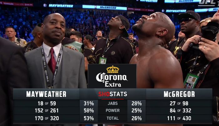 Ebből tisztán látható, hogy Conor többet ütött, de kevesebbszer találta el Mayweathert. Ez nem abból adódik, hogy pontatlan, hanem inkább abból, hogy Floyd kitűnően védekezett, nem véletlenül emlegetik őt úgy, mint a valaha élt legjobb defenzív bokszolóját.